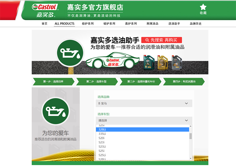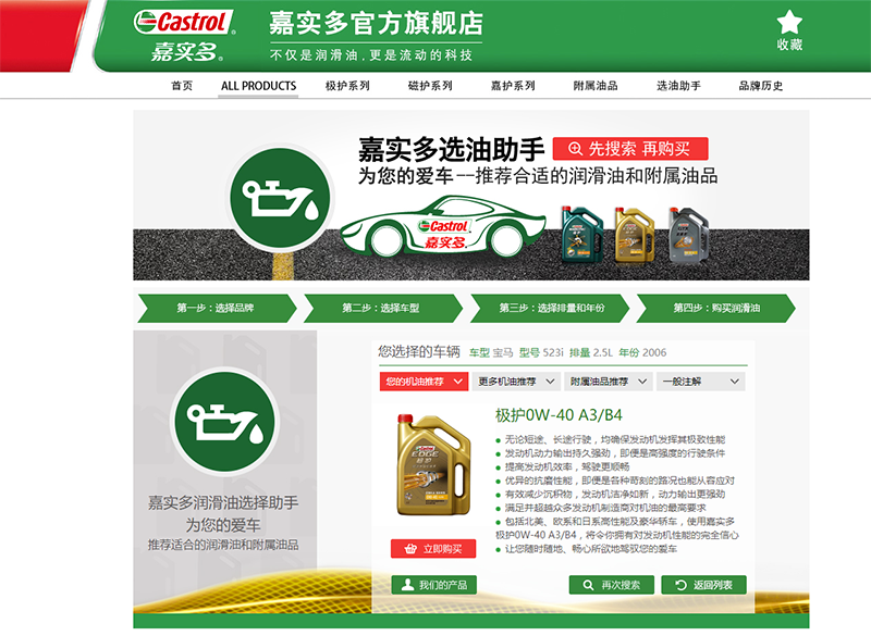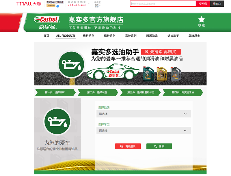 天貓旗艦店用戶為自己愛車挑選潤(rùn)滑油,可通過店鋪導(dǎo)航,進(jìn)入此應(yīng)用,輸入自己的車型、排量、年份等信息,即可查詢出相應(yīng)車型所匹配的潤(rùn)滑油產(chǎn)品,通過“立即購買“按鈕在天貓下單完成購物