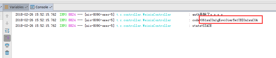 /** * <pre> * Description: wechat OAuth2.0 * Author: lllx * Version: 1.0 * Created at: 2018/2/1 * </pre> */@RestController@RequestMapping("/weixin")@Slf4jpublicclassWeixinController{@GetMapping("/auth")publicvoidauth(@RequestParam("code")String code,@RequestParam("state")String state){ log.info("auth開始了。。。。"); log.info("code={}",code); log.info("state={}",state);String url ="https://api.weixin.qq.com/sns/oauth2/access_token?appid=xxxx&secret=xxxx&code="+code+"&grant_type=authorization_code";RestTemplate restTemplate =newRestTemplate();String result = restTemplate.getForObject(url,String.class); log.info("result={}",result);}}這時我們再次訪問第三步拼接的url就可以看到如下結(jié)果。