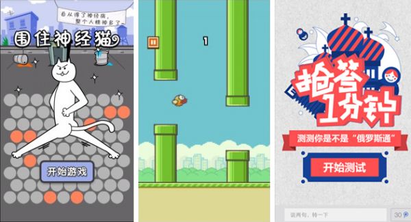 一大類是小游戲,早期的圍住神經(jīng)貓、虐心的小鳥等都是火遍朋友圈?!抖砹_斯閱兵—搶答1分鐘》參與互動(dòng)答題,再配上風(fēng)格獨(dú)特的手繪圖案,可以說是H5中的精品。