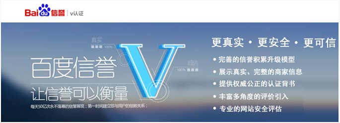 百度信譽(yù)V認(rèn)證,是百度公司最新推出的一套企業(yè)網(wǎng)絡(luò)信用體系,通過對(duì)互聯(lián)網(wǎng)商戶的資質(zhì)審核,并且憑借百度的搜索優(yōu)勢為商家提供一套綜合的誠信認(rèn)證產(chǎn)品;企業(yè)通過展示信譽(yù)認(rèn)證可以提升網(wǎng)民的信任度,增加企業(yè)品牌的影響力和公信力。