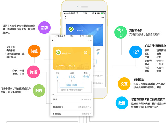 1、由于微信會員卡的接口是二次開發(fā)實現(xiàn)的,所以開通微信會員卡之前需要商家有一套支持微信對接會員管理系統(tǒng)和微信公眾號平臺賬號。