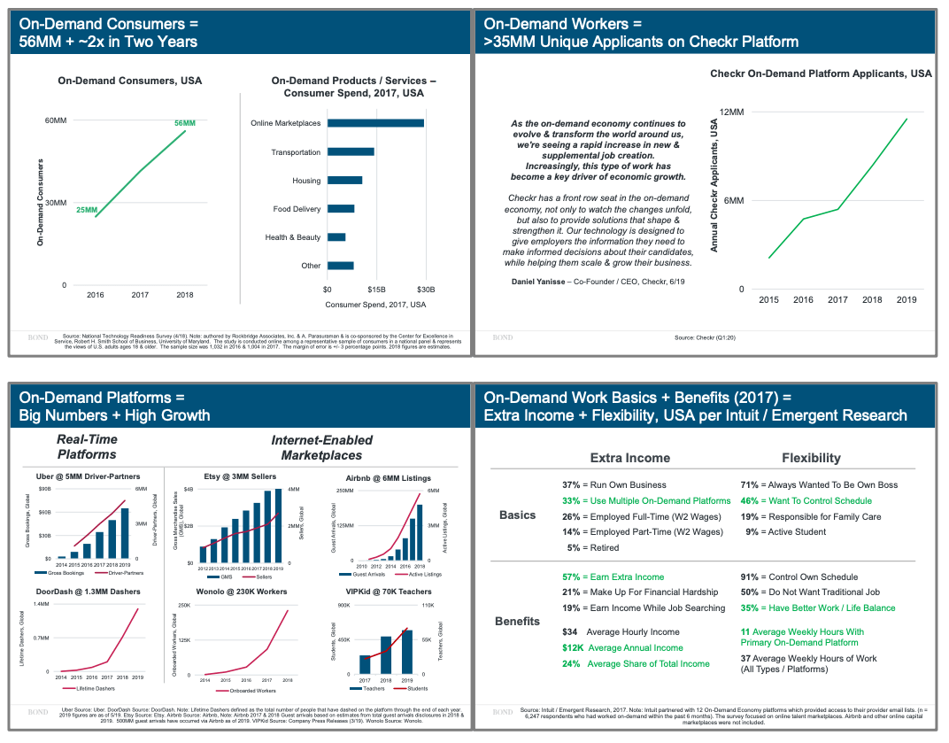 多年來,Bond Capital 一直在跟蹤線上服務(wù)企業(yè),包括 eBay、Etsy、Upwork、Airbnb,以及各類「按需服務(wù)」(on-demand services),比如 Uber、DoorDash、Instracart等,并且和 Automattic、Zapier 以及 GitLab 等遠(yuǎn)程協(xié)作服務(wù)供應(yīng)商進(jìn)行協(xié)作。