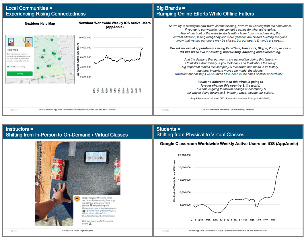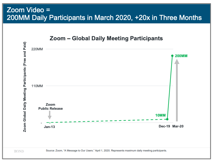 Bond Capital 今年的這份趨勢報(bào)告和以往不一樣,它并沒有按照以往命名為《Internet Trends 2020》,而是使用里《Our New World》這個(gè)名字。這份報(bào)告是前幾天早上以郵件的形式發(fā)給投資者,目前并未在 Bond Capital 的官方網(wǎng)站上予以更新。