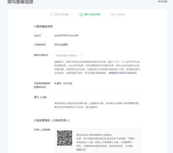 第六步:填寫備案信息 – 小程序信息填寫 和 ?小程序管理員(小程序負(fù)責(zé)人)掃臉認(rèn)證