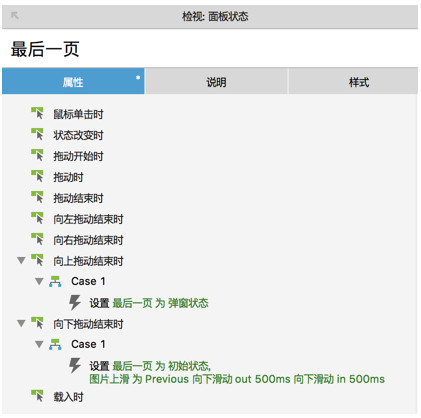 結合前面的分析,可以采用在動態(tài)面板的最后一個狀態(tài)里,做一些特殊的處理,比如向上拖動結束時的事件會添加出現(xiàn)彈窗的動作