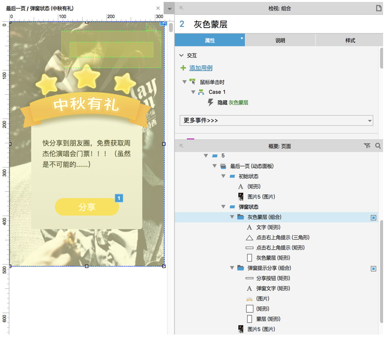 根據(jù)之前的分析,蒙層的邏輯是建立在彈窗出現(xiàn)的邏輯之上的,而且蒙層只有顯示和隱藏這兩種狀態(tài),鑒于上面一步彈窗的設計,那蒙層就比較好處理了,首先要注意圖層的順序,就是蒙層需要在彈窗的上方,然后只需要在彈窗狀態(tài)的情況下,根據(jù)不同的情況去設置蒙層的顯示和隱藏即可(對分享按鈕設置點擊事件,添加蒙層的顯示動作,對蒙層本身設置點擊事件,添加蒙層的隱藏動作)。