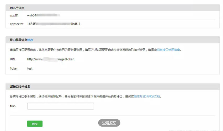 這段話就是說,我們在開發(fā)前需要在圖片中框紅的位置填入我們所要開發(fā)的域名。這里我們使用的是測試環(huán)境,所以需要在測試賬號管理頁面的這個位置填入我們自己的域名,這里要注意填入域名的規(guī)則。
