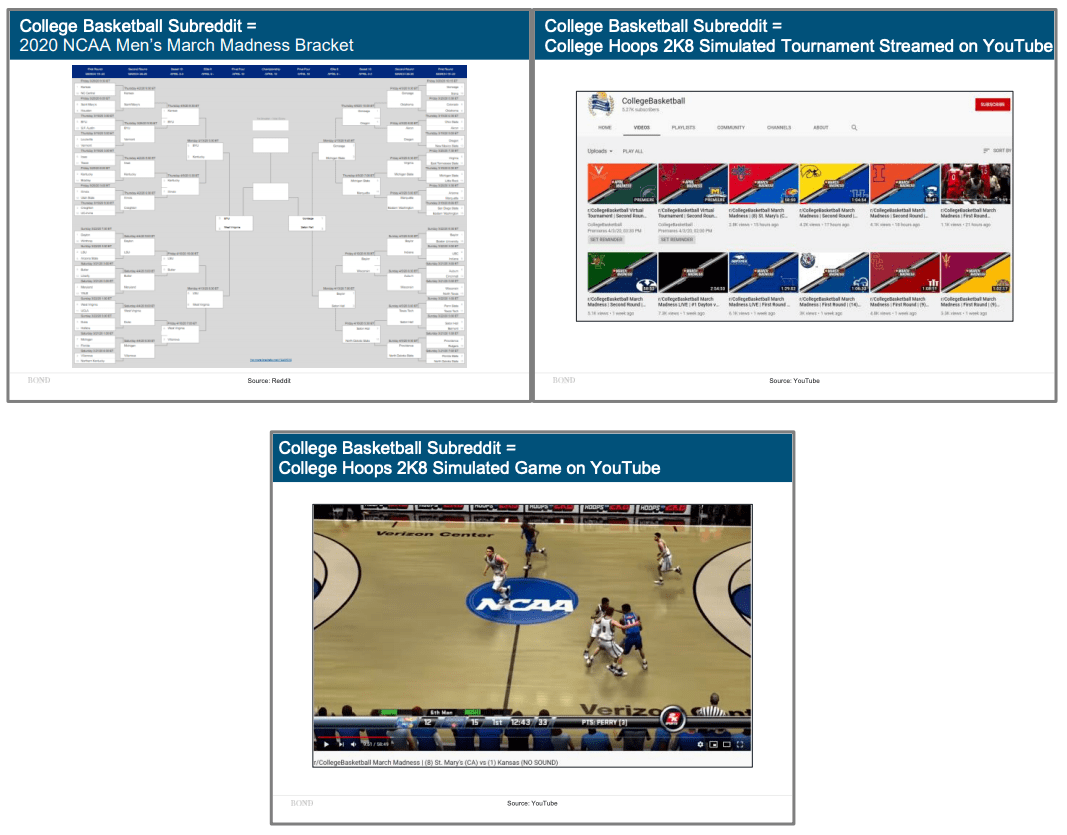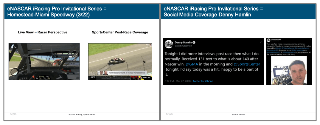 3月17日,NASCAR 和 iRacing 宣布成立 eNASCAR iRacing Pro 邀請賽,讓最專業(yè)的運(yùn)動(dòng)員在家參加比賽,使用 iRacing 的游戲系列進(jìn)行比賽,這些都在 Fox Sports進(jìn)行直播。而全美的大學(xué)生籃球賽則改在擁有12年歷史的游戲2K8 上進(jìn)行,首輪比賽已經(jīng)在3月底完成。NBA 在 2K20上進(jìn)行,西甲在FIFA 上進(jìn)行對(duì)決,Twitter 上有6萬多人觀看了決賽。